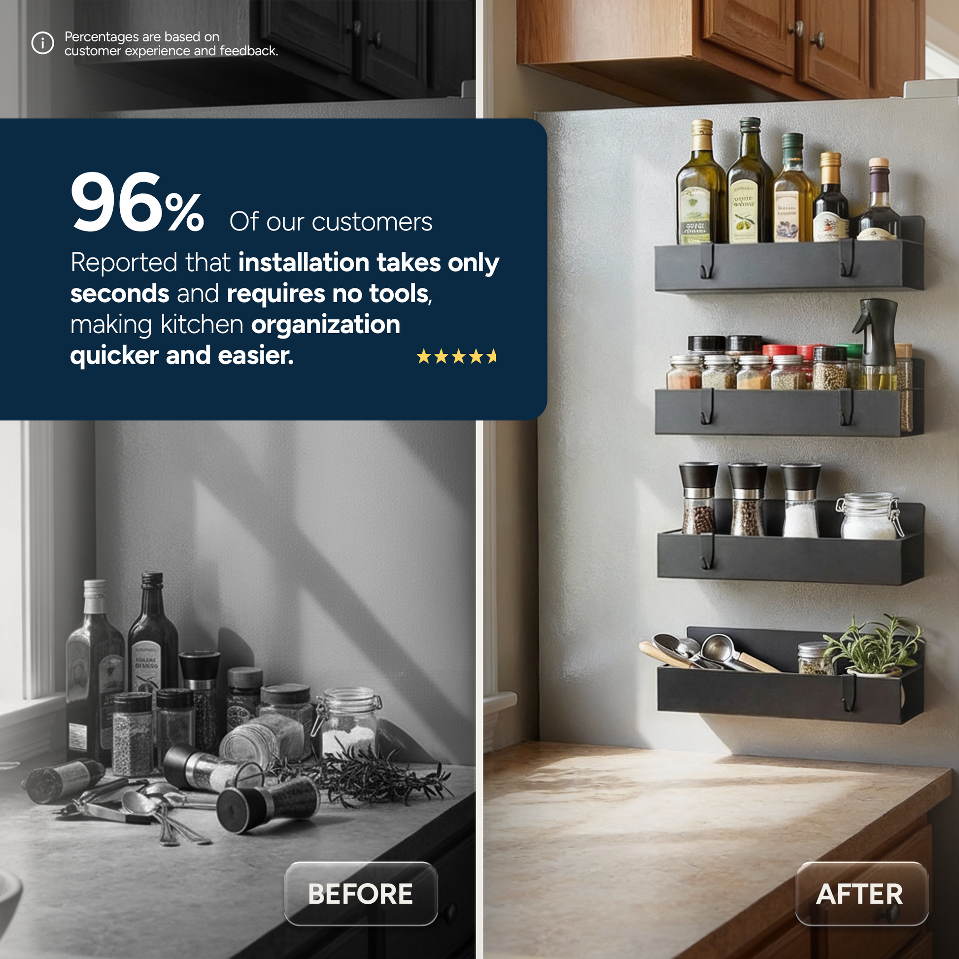 “I didn’t realize how much counter space I was wasting until I installed these. The magnets are incredibly strong, installation took seconds, and everything I use daily is finally off my counter and within reach. This instantly made my kitchen feel bigger and more organized.”
